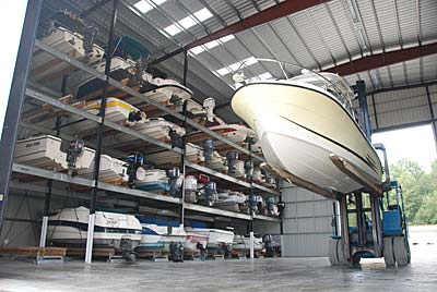 And it comes with all the benefits of dry storage: boats don't accumulate marine growth or oily water in bilges, and they're less likely to develop blisters from water soaking into the laminate below the waterline. Oh yeah, and they tend to not sink when they're stored out of water. Inside a closed storage facility, boats stay looking new for much longer, you don't have to worry about your boat's stereo suddenly disappearing and birds have to find someone else's boat to nest in.